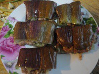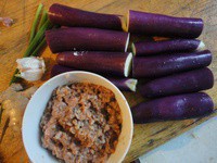 取一段茄子,由上至下分开,用手抹平。(注意,分开时后皮是连着的)这就成了一片茄子了,在一端放上肉末。