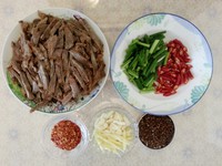 依次倒入小朝天椒、姜丝、蒜瓣、花椒、郫县豆瓣小火煸炒。将炸过的牛肉条倒入锅内,火由小火转文火,加入适量料酒翻炒。