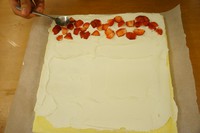 淡奶油厚的一边放入草莓粒,并用勺子将草莓压进奶油一点