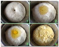 B料:60克油和1个蛋直接加入上面发酵好的面盆。调和一下油和蛋,再加入B料中的50克面粉。油蛋面粉调和后,再和A面团揉到一起。