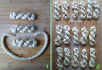 左手向前,右手向后,两手反方向搓,给面条上弦。两端合并,右手提起,面条自会相互缠绕。顺势多缠几下,再提起,麻花会自动扭转到一起,将一端塞入另一端孔内,就定型好了。