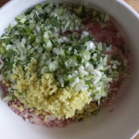 肉泥、葱姜碎放入碗中,调入生抽、老抽、盐、胡椒粉、2-3勺花椒水,延一个方向搅拌均匀即可。