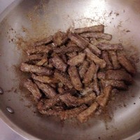 锅里入油下牛肉微煎'。然后加孜然粉一包'