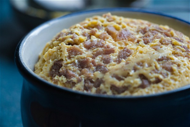 牛肉(包括汤汁)倒入蛋液。盖上保鲜膜,用牙签在保鲜膜上戳点小孔。上蒸锅,15分钟。