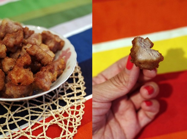 所有肉都过了一次油后,再将这些浅色肉块倒入大火中,翻转炸至金黄酥脆为止。出锅。