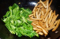 锅中放入香干翻炒2分钟,再加入少许生抽翻炒至香干变色。