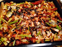 取出烤盘,把炒好的配菜倒在鱼身上,继续放入烤箱,看具体情况烤制10~20分钟
