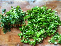 香菜切碎。辣椒先切成圈儿,然后再切几刀,使辣椒成半圆圈,又不至于太碎。