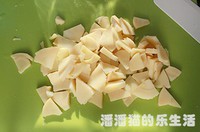 把切下来的整块冬笋肉放到放了盐的沸水中煮10分钟。将焯过水的冬笋切片