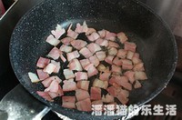不一会儿培根会渗出很多油脂,就用这些油来炒冬笋片,将冬笋片放入锅中,转中火一起煸炒三分钟。让培根的香味和油脂渗入冬笋中,之后烹入料酒调味