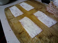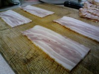 上述步骤完成后,开始制作千层面。首先准备一片培根。