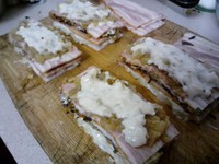 接着再放上一片培根,刷上酱,均匀地铺上咸土豆泥即沙茶酱的,然后最后一次刷上白酱最后盖上一片培根,轻轻按压一下,按紧。