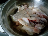 然后放入鱼骨,中火煮开,加入适量的盐捞匀,转小火煮8~10分钟。