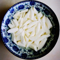 铁棍山药去皮洗净切成滚刀块,放入装有清水加少许白醋的大碗,浸泡20分钟。