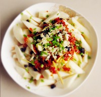 山药沥干水,撒上剁椒、姜丝、盐、豆豉。入蒸锅,上气后转小火15分钟左右。关火虚蒸5分钟。