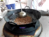另起一锅,放入白砂糖和等量水,开始大火翻炒,直到糖水开始变褐色时火力关小,一直不停翻炒,直到接近老抽的颜色,立即离火。一点一点加进4锅里,不能一次性加进去,因为温度很高,会喷溅,注意安全哦。