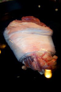 案板上铺一张寿司帘子,再铺上保鲜膜。肉皮在下,从一端开始,像卷寿司一样把肉卷起来。为了做出来的肘花漂亮,应该尽可能的一边卷一边用帘子压实并收紧肉卷儿。完成后,剪断保鲜膜。这时的肉卷儿里面会有一些汤汁,不会很结实,趁这时,隔着保鲜膜把肘花稍微再整理一下,尽量让肉皮包裹着所有的肉。