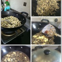 2. 锅中放茄丁多炒一会在放鸡蛋,放少许老抽炒会放水盖上锅盖。