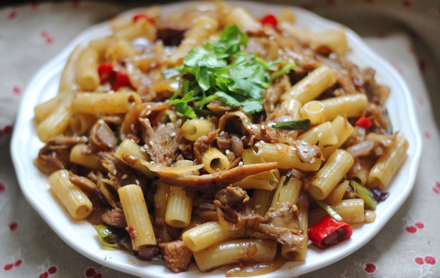 意面倒入国内继续翻炒加少量盐(郫县豆瓣很咸如果豆瓣酱放得多就不要放盐了)糖(我还放了一些孜然粉看口味喜好)出锅洒香菜叶