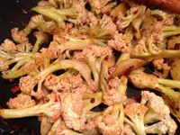 加入沥干水的菜花,大火翻炒,大概5分钟。