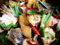 烹制时由炒锅转砂锅纯粹是图方便,若一锅煮好装盘上桌也完全可以;此做法除了调料不用加水,只要掌握好火候,一点不会糊锅;豆瓣辣酱、豆豉酱和生抽足够咸度,加少量的糖是为了提鲜,最后的白酒是为了去腥增香;以上,供参考。需要说明的是,花鲢鱼的散刺特别多,如果不是为了处理剩余材料,应该选用青鱼、鲶鱼等作原料;菜市场里,一个2斤左右的花鲢鱼头,相当于一整条花鲢鱼的价格,家里用餐人多的话,选择买整条鱼还是比较划算的。