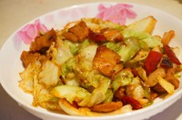 待肉炒得微焦时候,加入干辣椒(干辣椒选择这个时候加入,是因为早放油温太高,炒的时间太久会使辣椒糊掉)和包菜。