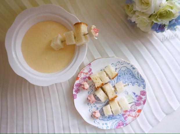 起司火锅太过瘾,喜欢起司的一定要尝试下,可以把吐司、水果、棉花糖、饼干之类的串起来蘸着吃,嗯,那滋味,自己感受吧。方子来自《蓝带甜点师的百变吐司》