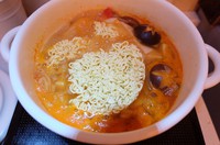 火锅料们浮起来(证明熟了)后放泡面,煮一两分钟