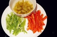 青椒红椒切细丝,姜切细,野山椒从中间切段,泡野山椒的水留着等会用。