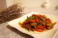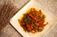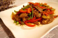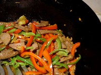 再加入青红椒丝翻炒,加少许盐、鸡精提味。翻炒均匀之后加入炒好的猪肝和野山椒水,