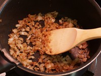 把孜然籽倒入空出来的锅,炒出香味之后倒入洋葱和蒜蓉,炒至变成黄色,大概炒10分钟