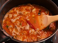 把肉桂棒、干辣椒和月桂叶取出,先关火,放入咖喱块至其溶解,再开火,加入●稍微煮一会儿