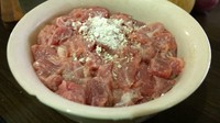 猪肉切丁,加适量水和淀粉搅拌,备用。