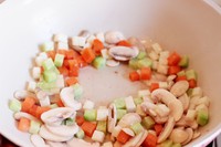 锅内烧热油,胡萝卜,蘑菇,杏鲍菇,黄瓜,土豆翻炒出香味,小火盖盖焖一会儿,杏鲍菇会出水。