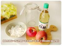 准备材料:苹果2只(果肉净重约500克),白醋/米醋一瓶500克,冰糖250克所需工具:水果刀,1.5L—2L玻璃密封容器方子参考:《果酱果醋水果酒》----------------------------------------【一句话概括制作过程】苹果去皮切片,一层冰糖一层苹果片,倒醋,加盖,等。买的永味堂糯米酿制白醋,不知能否比大米酿制的醋更甘甜些。