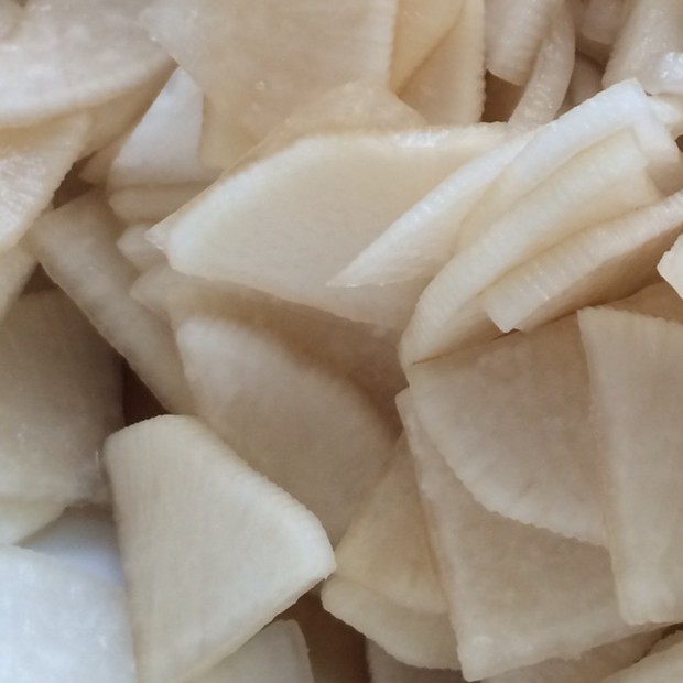 白萝卜一根洗净削皮,切成四分之一薄片,加适量盐腌大概半小时左右。