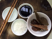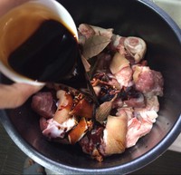 将所有调味料、大料、姜片都倒进锅里,再适当加一两勺水(20克)。