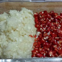 趁冰鸡爪的时间,把蒜米和辣椒剁碎备用