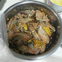我全程腌制了四个半小时。下午做饭时取出鸡翅。平底锅加少油小火煎。两面焦黄时把小碗里余下的蒜末撒在鸡翅上。翻面煎出蒜香味。出锅。。