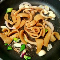 煎锅到底油,煸香葱,蒜,葱头,放入鱿鱼条。