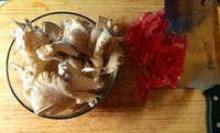 把蘑菇撕成细丝,这里要撕得稍微细一点,有的蘑菇根部比较粗,要多撕几下。