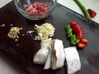 蒜去皮剁碎、青红辣椒洗净切圈、瘦肉洗净切小丁、姜洗净切末、咸鱼洗净切块。