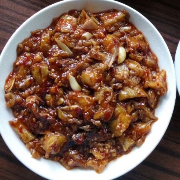 倒入茄子,火不要太大,变软即可,因为已经炸过。倒入调好的汁料(糖,生抽,料酒,香醋,清水,比例为1.5:1:0.5:1:3)大火爆炒。