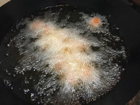 锅内多放油,至少保证能没过丸子,这样丸子才能全部炸到,否则容易出现炸的不均匀情况。油温3成热冒烟,下入丸子,下丸子后不要搅动,否则丸子就散了。待丸子略微变色,外壳炸硬,再用漏勺翻动。如果丸子有粘连,用勺子轻轻磕开即可。中火炸至丸子变色至金黄略深,中间不需要出锅复炸,即可出锅。出锅的丸子最好趁热吃,冷了口感会差一些。