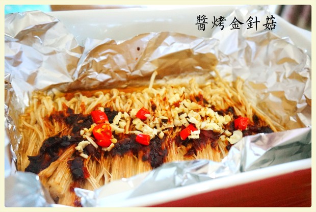 烤盘放锡纸,锡纸抹少许油,金针菇铺开,铺一层涂一层步骤2中的酱汁,最后把剩下的酱汁倒在最上面,蒜末辣椒圈铺在最上面。