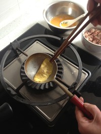 一、我也看过用平底锅的方子,觉得真的不大方便啊,还是勺子好。图中勺子的尺寸我量了下,总长是30cm,勺子直径10cm,深度是4cm二、蛋液和猪肉馅的量只是我用的,和勺子的大小,肉馅放多少都有很大的关系