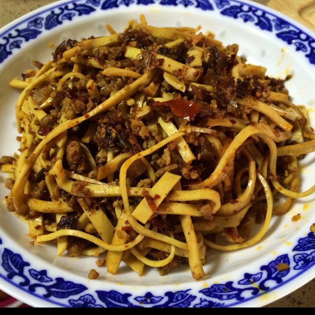 炒几下看到肉末已经被香辣菜汁浸透了,豆腐丝水中捞出不用沥太干就可以入锅一起炒了,一直翻炒,让豆腐丝裹上香辣菜油汁,炒着炒着可以少次少量加点水焖一下入味。收汁起锅,流口水。