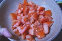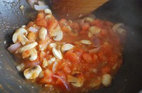 倒入切好的番茄和蘑菇,煸炒至番茄出水蘑菇变软