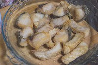 买来的青鱼洗净后厨房纸上沥干,切成合适大小的块状,用葱姜蒜粉和料酒腌制约10分钟,再加入玉米淀粉抓捏,使每块鱼都均匀裹上一层淀粉,备用(做这步时满手的鱼腥味儿就没顾上拍照片)