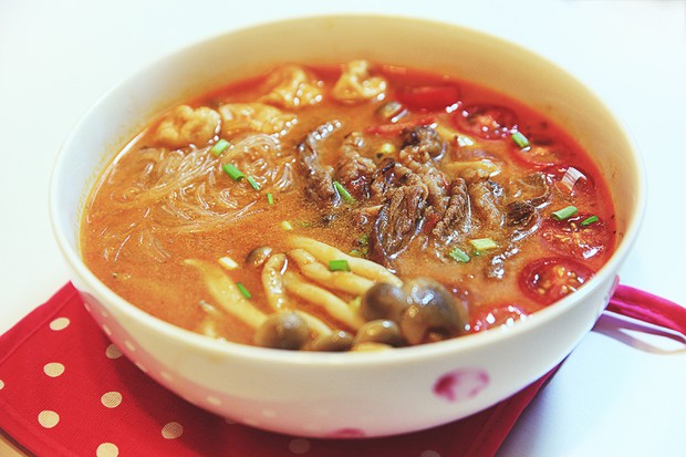 红红的番茄浓汤头,菌菇与肥牛、粉丝的完美结合,冬天喝实在太爽了!